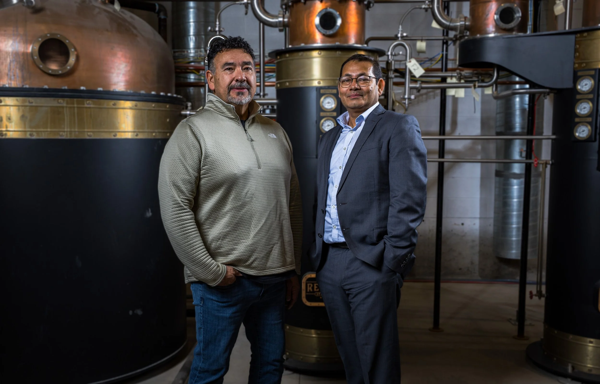 Robert Walsh, Operations Manager and Master Brewmaster (on left) and Kiran Shrestha, Master Distiller (on right) inside Queen City Distillers.